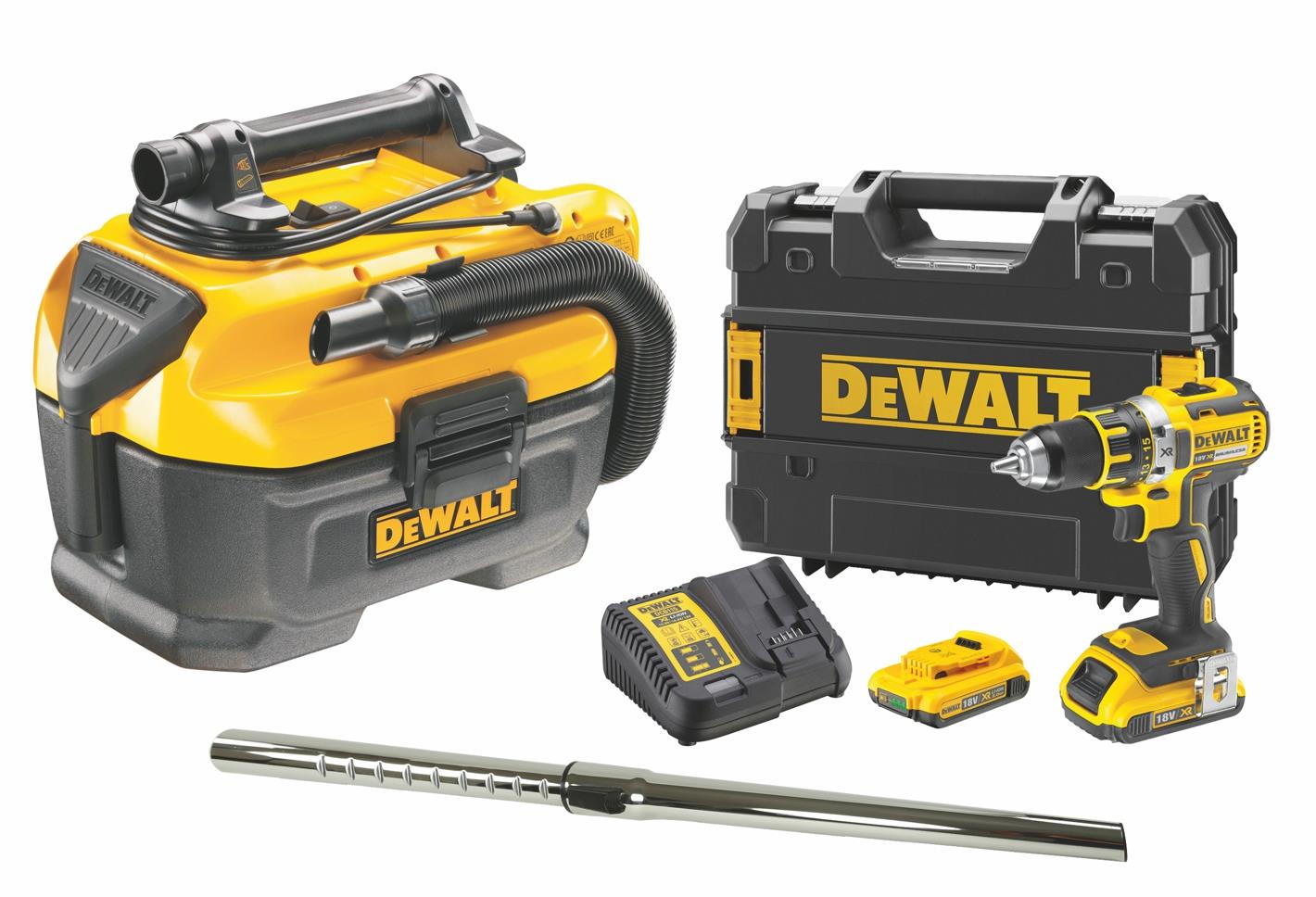 Der neue DeWALT Akkusauger ist kompakt und handlich konstruiert. Jetzt ist auch der Einsatz von bis zu 54 V-Akkus der XR-Serie verwendbar. Das Zubehör ist praktisch am Gerät angebracht. Durch umstecken des Schlauches hat er auch eine Blasfunktion. Das Kabel wird praktisch um den Tragegriff gewickelt. Der Schmutzbehälter lässt sich mit nur einem Schnappverschluss vom Gehäuse lösen. Vor dem Motor sitzt noch der bewährte auswaschbare Hochleistungsfilter, der 99,7 % der Staubpartikel (ab 0,3 Mikron) auffängt. Der DCV584L ist staub- und spritzwassergeschützt und besteht aus stoß- und bruchfestem Material. Zum Einsatz kommen Li-Ionen-Akkus aus der XR-Familie (14,4V bis 54 V). Technische Daten: - Tritt- und knickfester 2m-Schlauch - Nass- und trocken saugen - Behältervolumen 7,5 Liter - 230V/300 Watt - 87 dB Technische Daten Schrauber Modell DCK795D2T: - Akku-Schlagbohrschrauber - Bürstenloser Motor - Lithium-Ion Technologie - Integrierte LED-Leuchte - 2 Premium Li-Ion System-Akkus 18V/2,0 Ah - 2-Gang-Vollmetallgetriebe für perfekte Kraftübertragung - Problemloser Langzeitschutz durch Sicherheitselektronik (permanate Überprüfung von Akku-Temperatur, Stromantnahme und Entladeschutz) - Äußerst kompakte und ausbalancierte Bauweise sowie gummierter, ergonomischer Handgriff für Sicherheit und Arbeitskomfort - 13 mm Schnellspann-Bohrfutter und automatischer Spindelarretierung - Leicht dosierbare Schalterelektronik für exaktes Anbohren und präzises Schrauben - Lehrlaufdrehzahl: 0 - 600 / 2000 U/min - Gewicht inkl. Akku 1,7 kg Lieferumfang: - System-Schnelladegerät (ca. 40 Min) - 2 x 2,0 Ah 18V Li-Ion Akkus - Gürtelclip